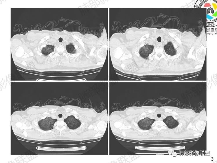注意肺孢子菌肺炎的肺部影像看上去比较“干”,不会呈现重力趋势。肺血管影及支气管影都比较清楚,尤其是含气支气管影,常常会衬托得格外清晰。