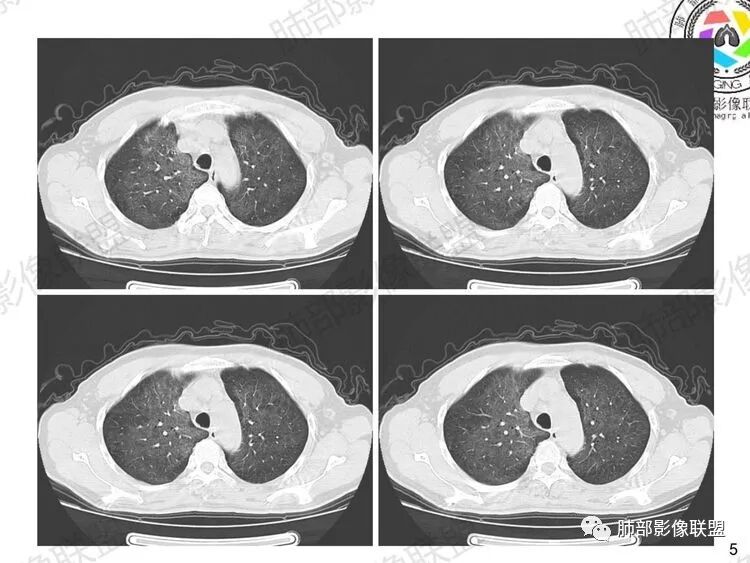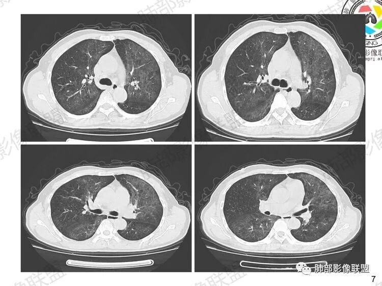 结合患者症状典型的呼吸困难症状及影像学改变,临床症状轻,影像重,双肺从中心向外周对称性弥漫分布的磨玻璃影,无重力分布,胸膜下受累不明显(月弓征),呈典型的间质性改变,需要考虑肺孢子菌肺炎的可能,临床上需要结合有无HIV、使用免疫抑制剂病史、器官移植等免疫缺陷病史,还可以借助化验CD4细胞、LDH等进一步判断病情。
