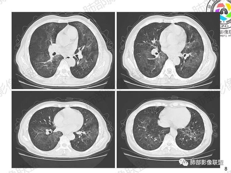 1、双肺从中心向外周对称性弥漫分布的磨玻璃密度影,无重力分布特点