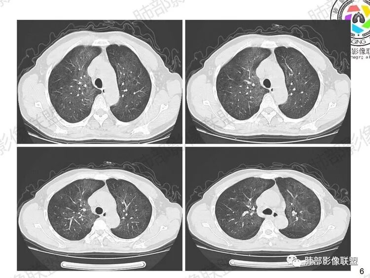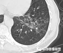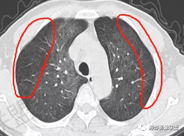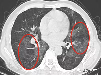 一切∮随缘:双肺多发斑片状渗出影,边界模糊,部分周围可见正常肺组织,其内可见血管走行自然,支气管无明显改变,病变整体以中内带为主,胸膜下受累不明显。