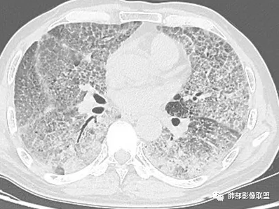 中年男性,呼吸困难为主。两肺弥漫性GGO,上肺内夹杂小囊。胸膜下累及少,未见明显小叶间隔增厚,两下肺可见小叶内间隔增呈小网格征,左下肺可见索条灶,急性感染临床不符合,第一想到了PCP,中期,所以需要查 HIV。第二肺水肿,但是两肺门不是对称,小叶间隔增厚几乎看不到,所以不考虑。第三过敏性肺炎,肺泡改变?第四滤泡性细支气管炎。第五弥漫性肺泡损伤,药物性?但没有特殊用药病史所以排除。综上还是考虑PCP可能大些。