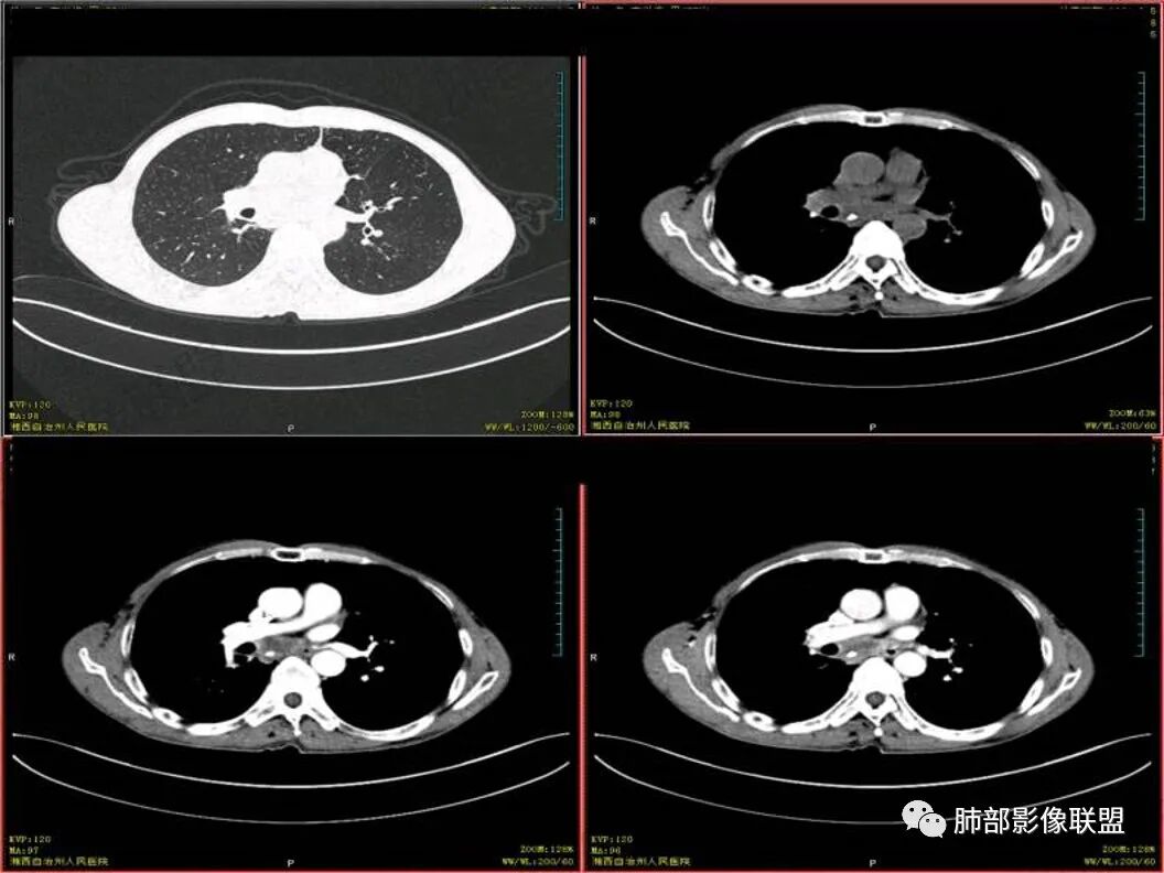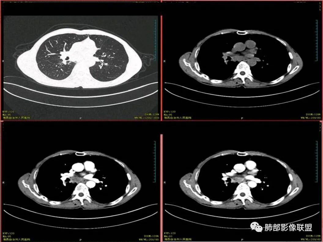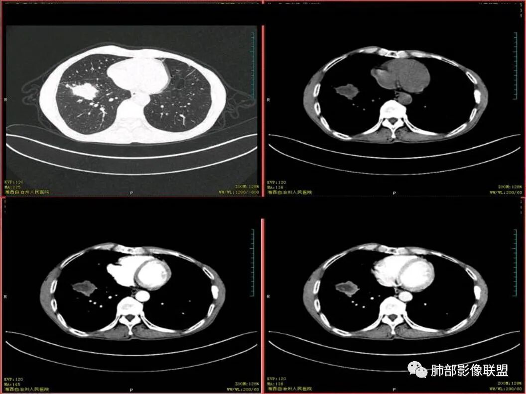 结核和肺癌鉴别,因为淋巴结坏死疾病就这两种,坏死来看并不像小细胞肺癌。主病灶膨隆,增强后,壁厚薄不均,有壁结节感觉,首先是不能放弃的是肺癌这个诊断。具体哪一种还是主要看病理,建议支气管镜穿刺淋巴结的。