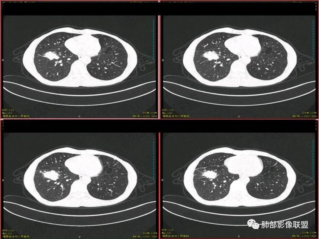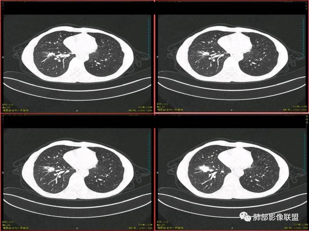 胸CT可见右肺下叶前基底段占位性病变,病灶周围可见周围不清毛玻璃影,病灶边缘可见分叶,呈膨胀性生长,纵隔窗可见病灶内呈偏心性坏死,增强扫描静脉期强于动脉期,纵隔隆突下淋巴结可见肿大坏死。