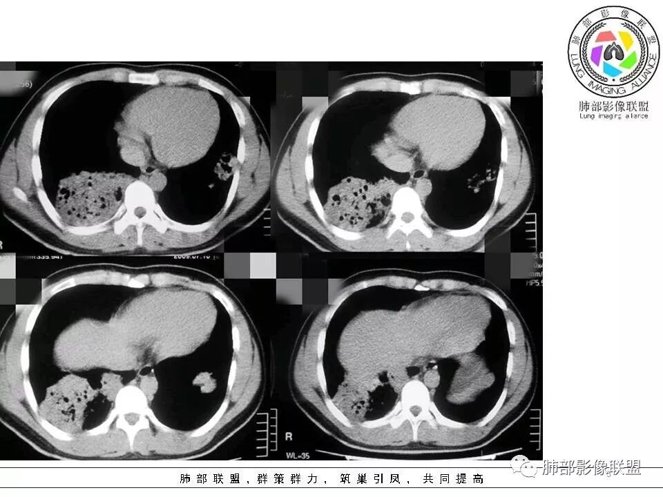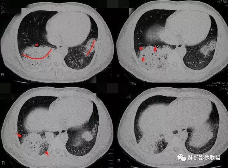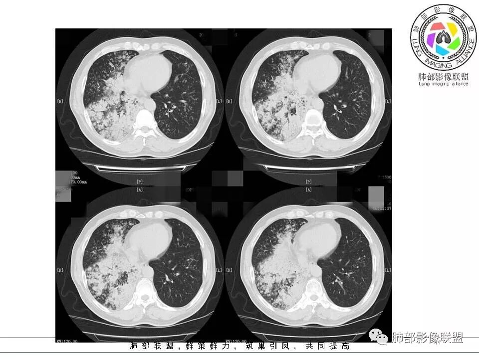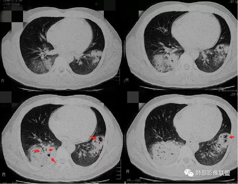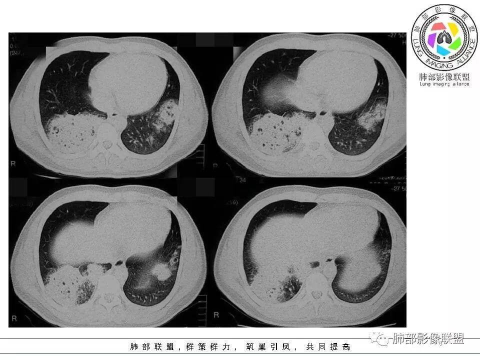 1,双肺大片状密度增高影,其内见无壁空洞影,结核?干酪性肺炎?