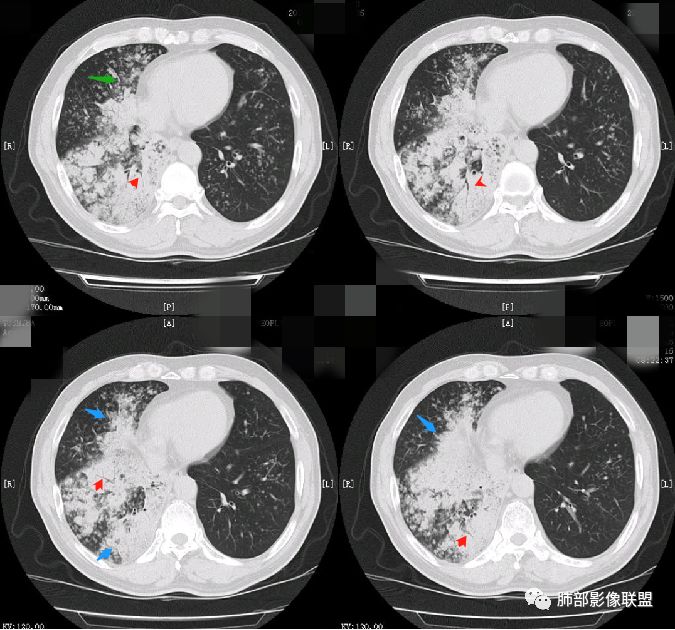 支气管走形僵直、狭窄、中断,分支减少,呈“枯树枝”改变(图1-4红色短箭头)。可惜没有增强,不能了解病灶强化及血管情况。