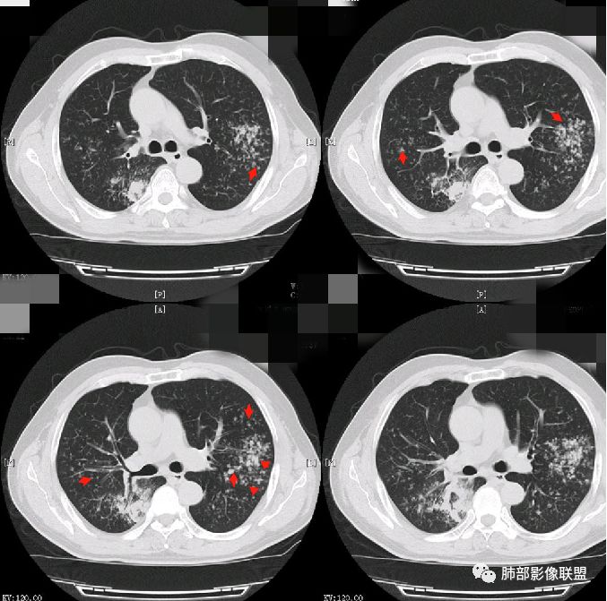 磨玻璃结节沿支气管飘散并落脚其他肺叶和肺段