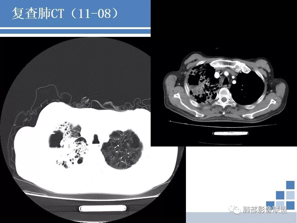 老年男性,起病急,感染指标高,肺部CT示肺气肿征象,双肺见肺大疱,感染病灶。予以碳青霉烯抗感染病灶出现明显进展,出现虫蚀样空洞、气液平。考虑患者细菌感染合并结核可能性大。但是结核进展可能太快了,需要排除真菌。