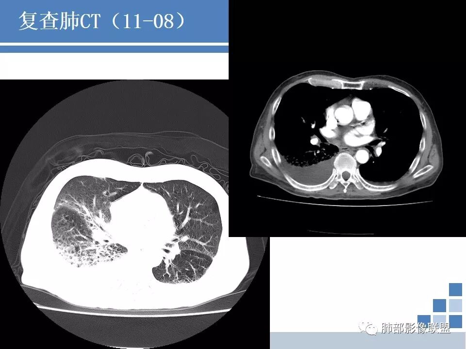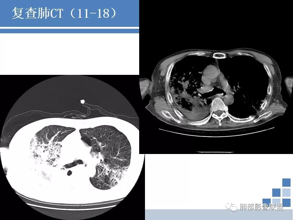 CT:肺气肿肺大泡背景,右上肺磨玻璃及实变影,10天及20天复查影像明显进展至两肺更大范围,伴右侧胸水。