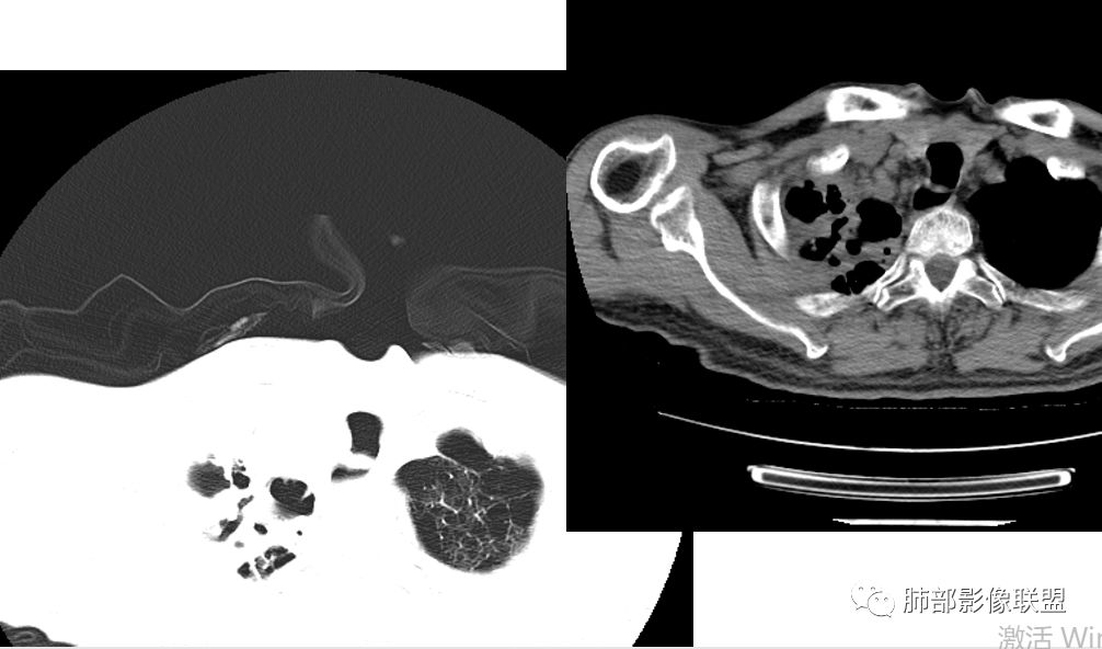 晨读:肺气肿肺大疱基础,有慢性病,病灶进展快,主沿胸膜下分布,胸腔积液出现,实变和蜂窝改变,空洞形成并伴液平,考虑结核合并细菌感染,至于鉴别聆听各位老师分析了。