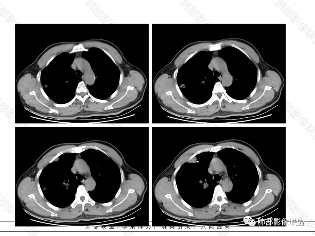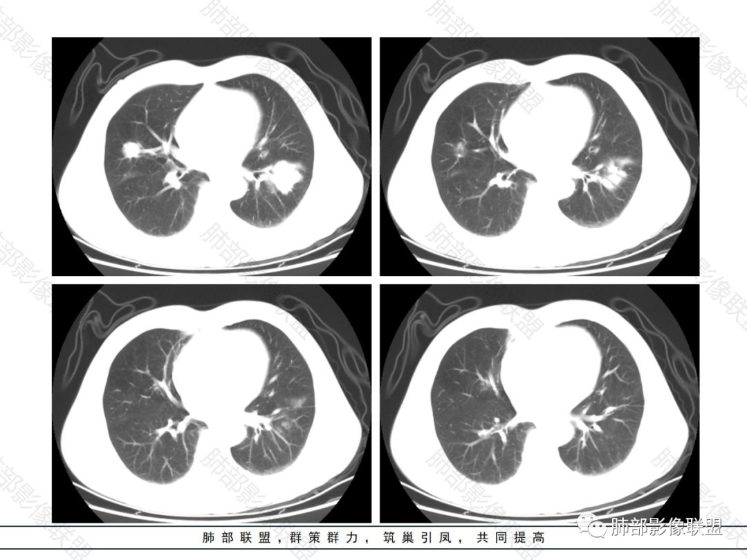 肺内淋巴瘤的影像学表现形式各样,总共有五种类型,⑴结节肿块型、⑵肺炎肺泡型、⑶间质型(支气管血管淋巴管型)、⑷粟粒型、⑸混合型(多种形态并存),不过小编认为分型只是对于病灶形态的描述,很多情况下多种类型并存,其中粟粒型分型比较少见。