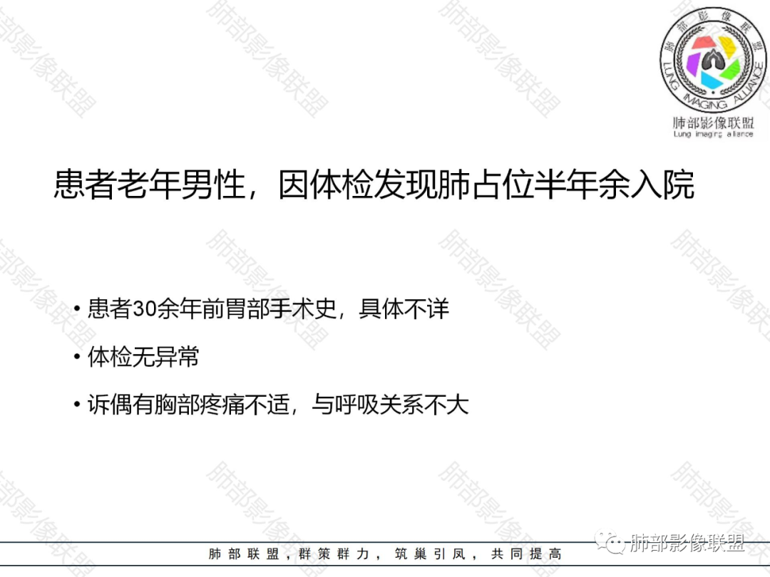刚看了视频,老年男性,体检发现,30年前有胃部手术史。双肺野多发结节肿块影,沿支气管血管束或胸膜下分布,有的结节内似有小空洞,支气管进入走形自然,肿块边缘膨隆,有分叶,支气管进入后有的截断,大部分支气管穿过,走形自然,纵隔内未见明显肿大淋巴结,总体考虑淋巴瘤,炎性肉芽肿(肉芽肿血管炎或隐球菌肺炎)等。考虑后者可能性大,肉芽肿血管炎或隐球菌肺炎,鉴别淋巴瘤。