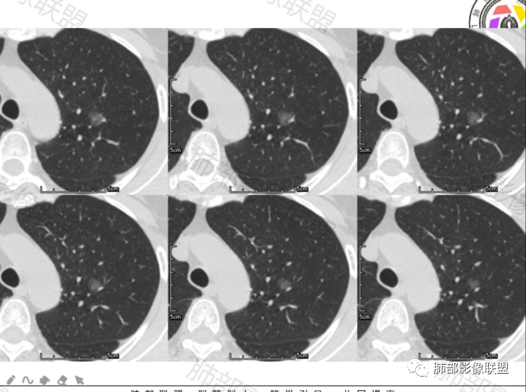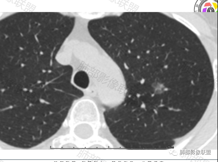 病例一:中年男性,左上肺纯磨玻璃结节,边界清,无明显分叶,病灶内见血管穿行,血管隐约稍移位,内部隐约见小空泡,10个月复查 ,GGO持续存在稍稍增大,考虑AIS可能性大,建议继续随访(3个月)。