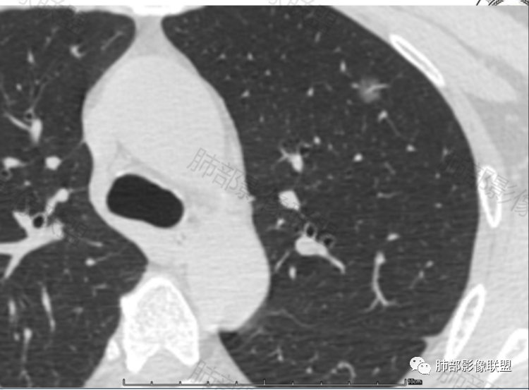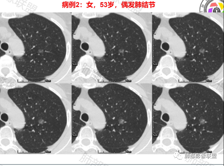 病例1,中年男性患者,左肺上叶尖端磨玻璃结节,边界清晰,内部见血管及空泡(也可能是支气管),10个月复查有轻微增大,考虑原位或微浸润,短期内随访,也可手术
