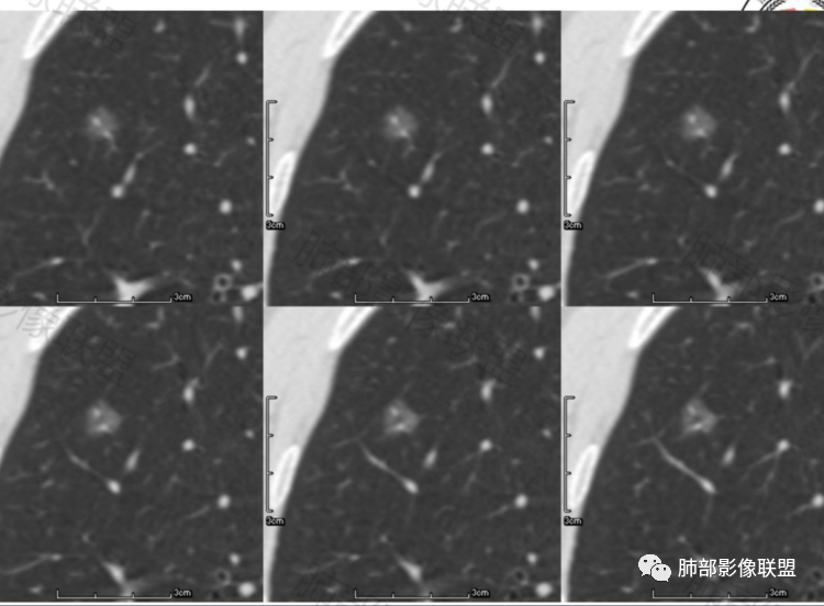 典型病变表现为纯磨玻璃影中出现小于5MM的实性成分,薄扫加三维重建是诊断的关键。