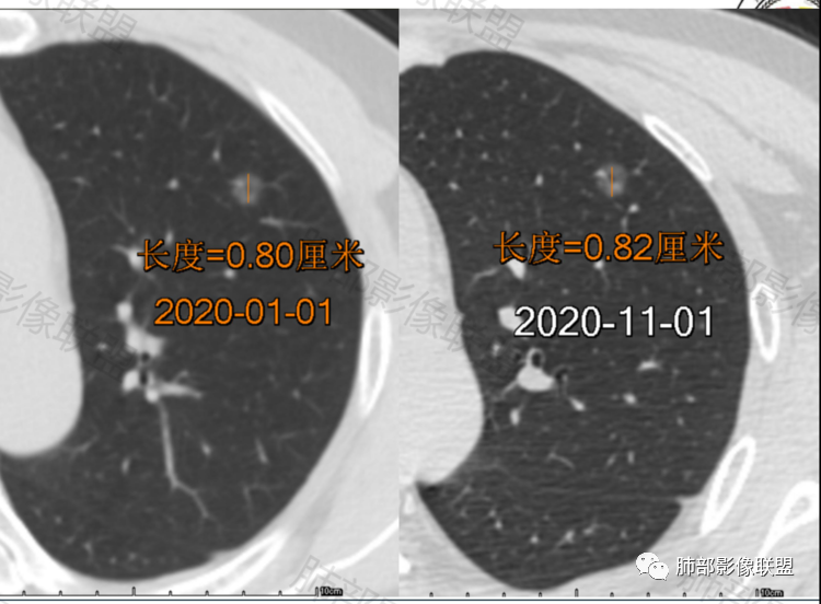 这两个病例都是偶发肺内孤立结节,以磨玻璃密度为主,无明显实性成分,边界清晰,并且都经过长期(10-14个月)随访复查,病灶整体大小、形态、密度变化不明显。