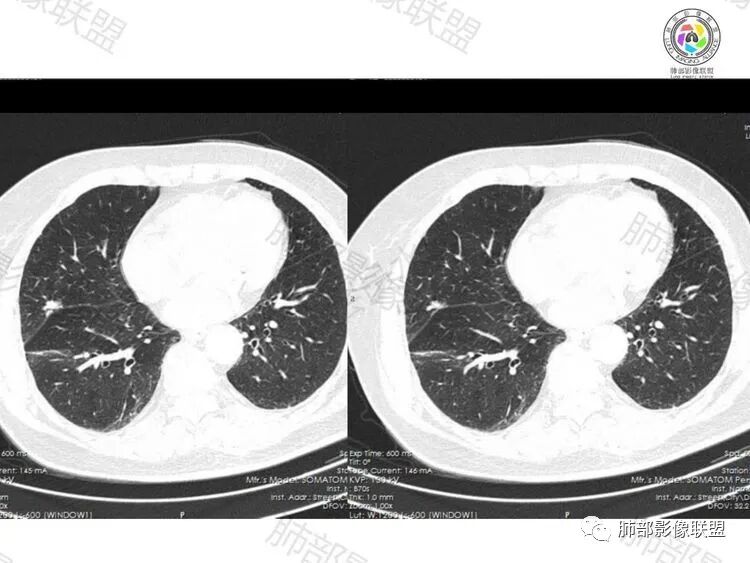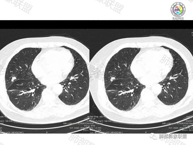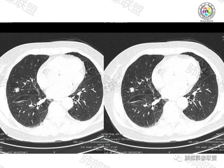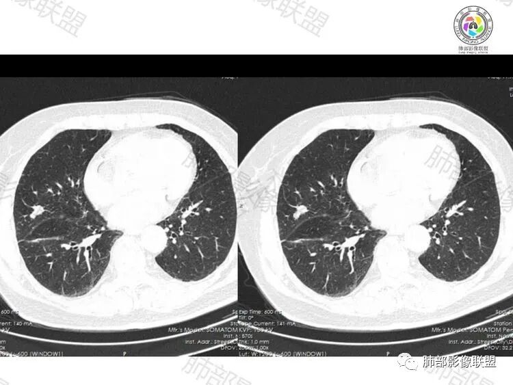3.隐球:此例有多结节融合感,有“蘑菇兄弟”,隐球需要考虑,但隐球多无明显收缩力,周围有晕,毛刺细软,支气管多不受累及,多分布在外围及胸膜下,可以提示诊断。