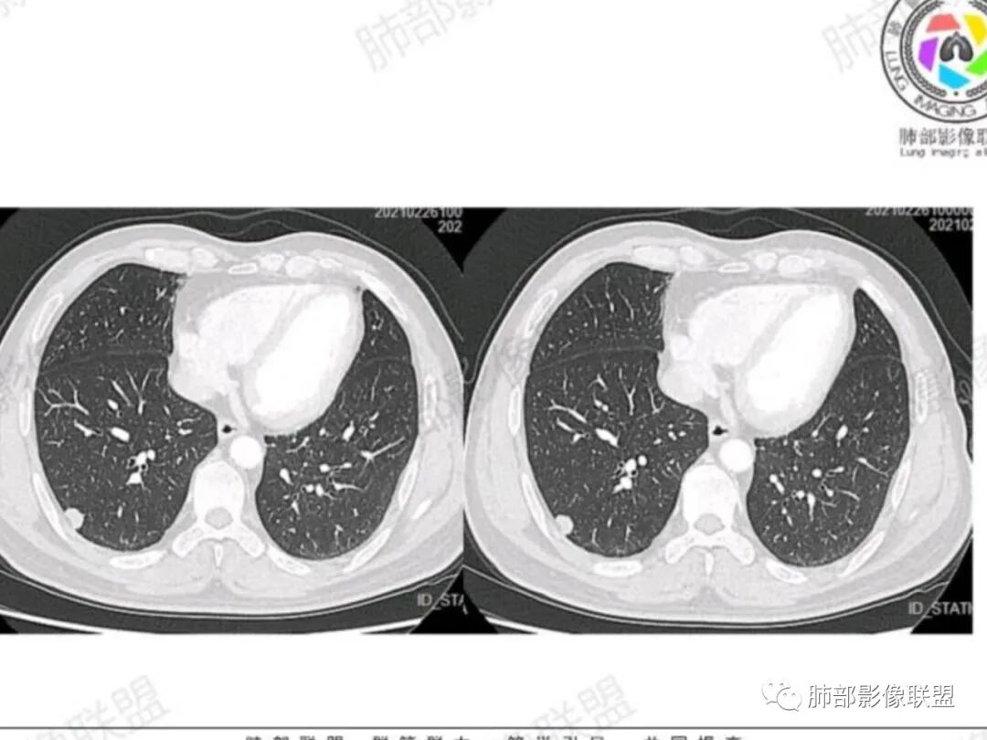 中老年男性,体检发现,右肺下叶胸膜下结节,浅分叶、毛刺,均匀强化,考虑恶性