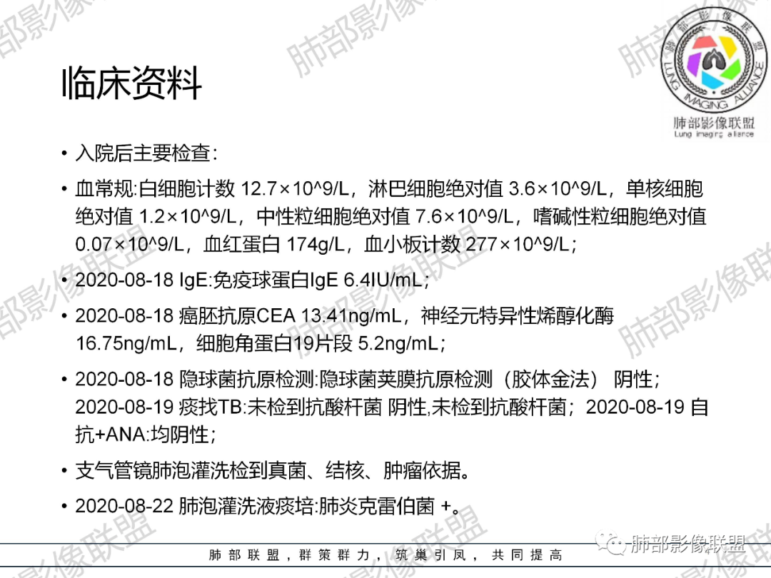 上面PPT中临床资料支气管镜肺泡灌洗中漏了一个“未”字,肺泡灌洗XPERT、隐球菌抗原试验、肿瘤细胞学都是阴性的,