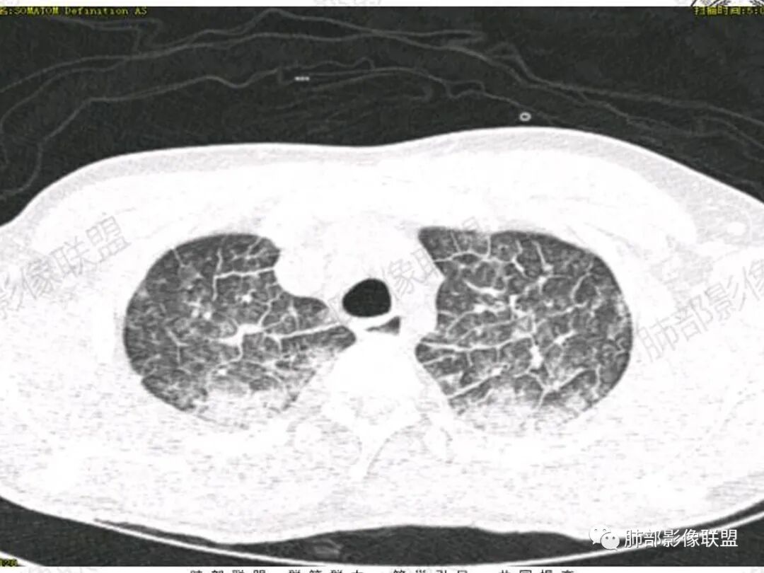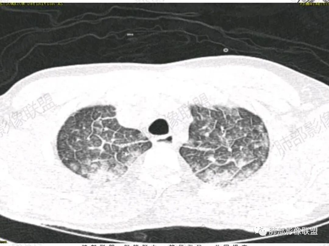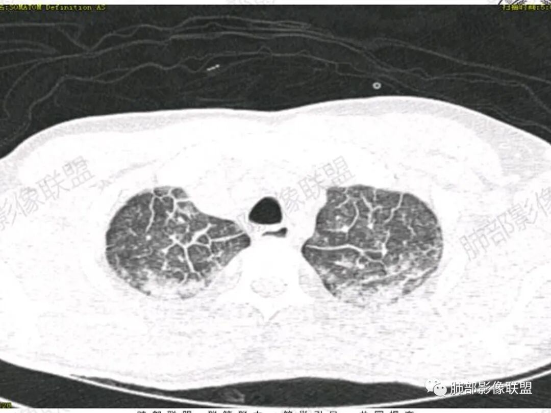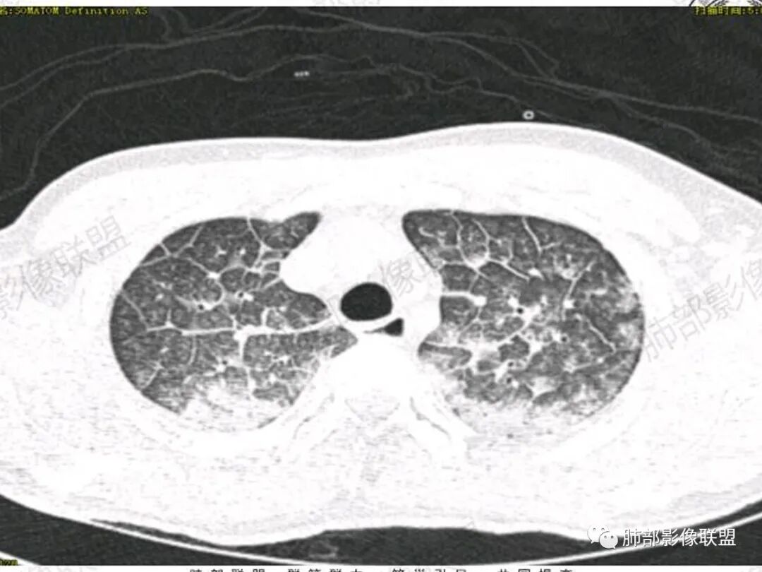 影像:两肺上叶小叶间隔增厚,斑片,腺泡结节,重力分布,下肺不累及