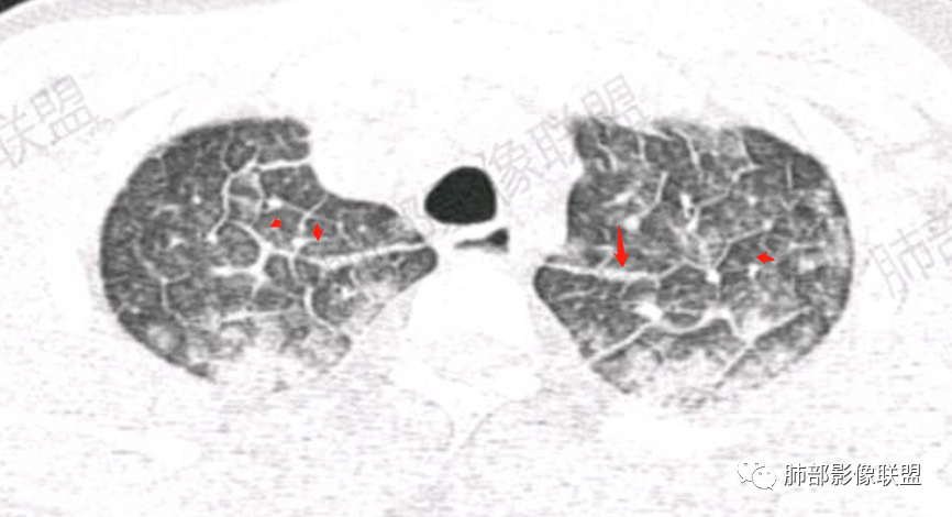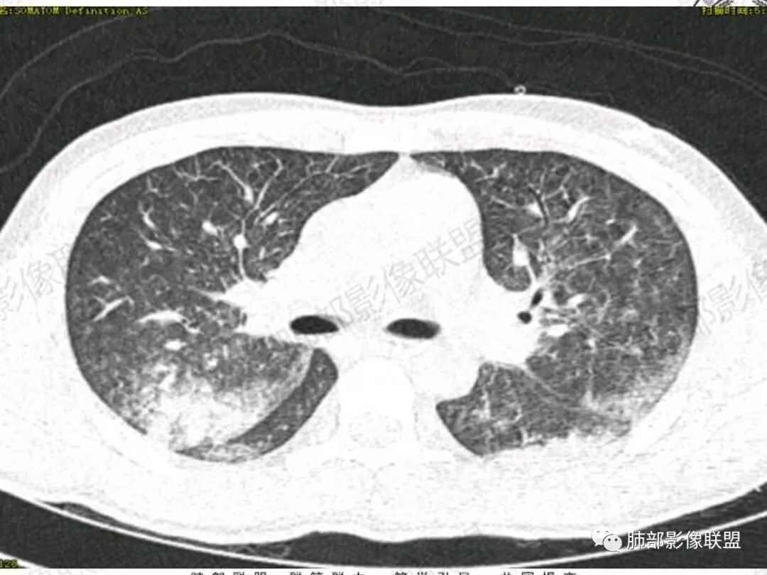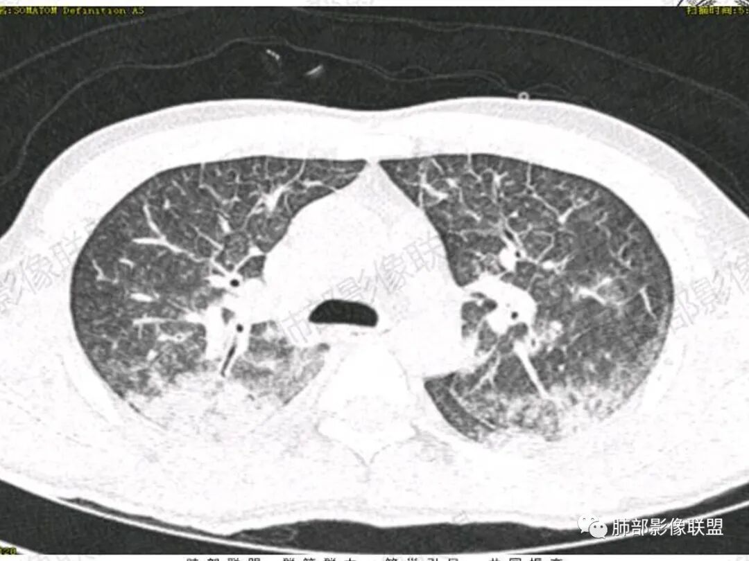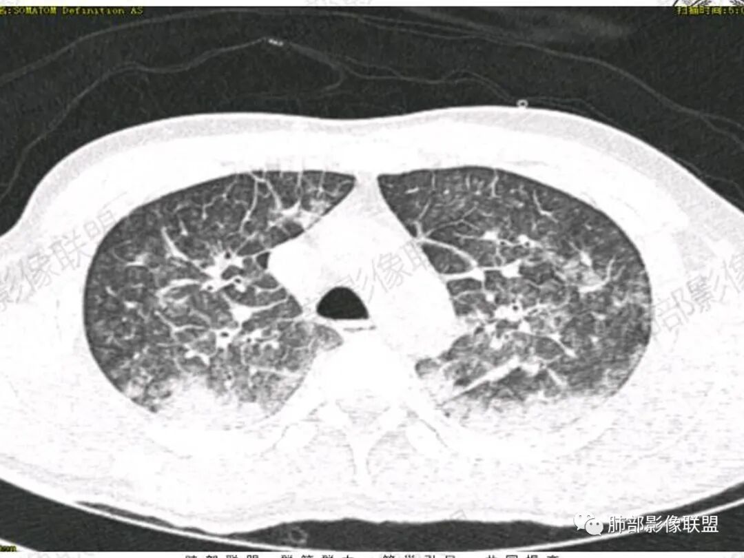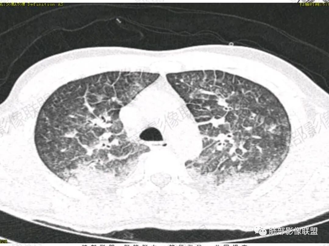 影像:两肺上叶小叶间隔增厚,斑片,腺泡结节,重力分布,下肺不累及