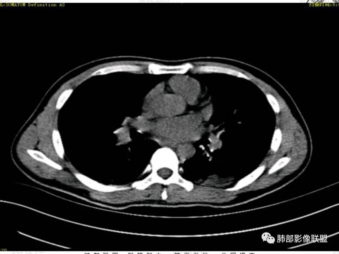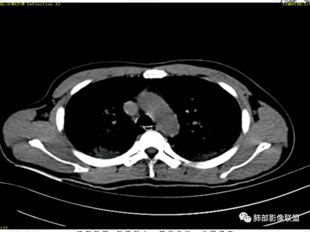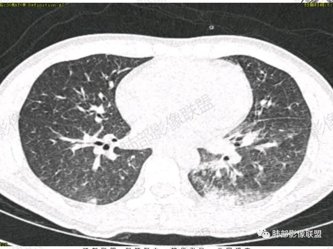 青年男性,气促7小时入院,意识模糊,白细胞及中性粒明显增高,PCT增高,CRP不高,心率快,体温正常,血压正常。胸部CT:双肺上叶小叶间隔光滑增厚,中轴间质增厚,弥漫性磨玻璃、多发斑片影,以上肺、背侧分布为主。影像表现考虑为肺水肿。病因:病史不支持肾功能衰竭、心源性、高原性肺水肿,无发热,似乎也不支持细菌、病毒、真菌等感染引起。吸入毒物?吸入水?