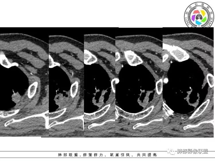心灵鸡汤:左肺尖团状影,内有空洞,似有壁结节,边缘有毛刺,周围见局限性肺气肿,考虑恶性肿瘤,腺癌?鉴别空洞型肺结核,肺脓肿南边:胸膜也不踏实