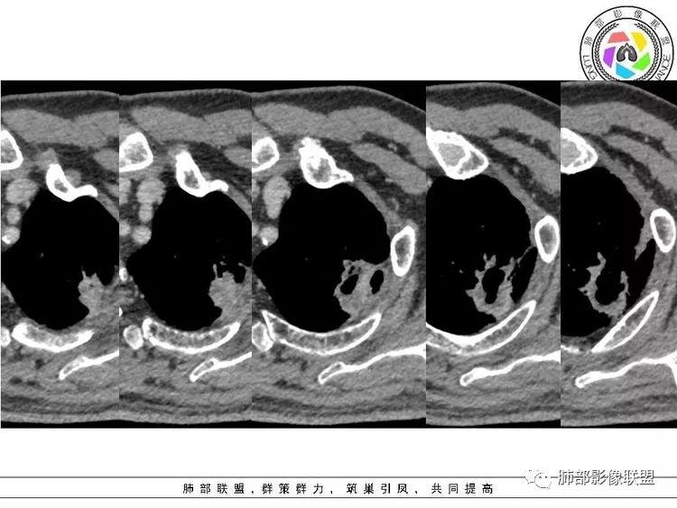 Lotus:支持恶性的征象,假大空,支持良性的征象环形强化RockJ-ason:老年男性,吸烟史,不规则厚壁,周围有囊腔,中等度强化,无卫星灶,首先考虑恶性,有些支持鳞有些支持腺,拿不准RockJ-ason:鉴别结核一切∮随缘:左肺上叶空洞,洞壁较厚,不规则,紧贴胸膜,有血管牵拉,增强后轻度强化,周围有肺气肿,老年男性,考虑鳞癌,鉴别结核(周围比较单一,无树丫)