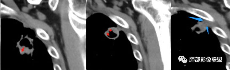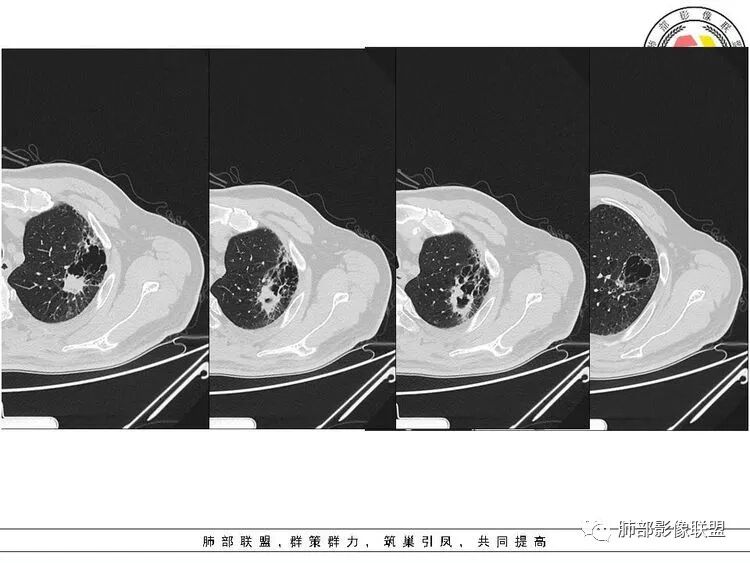 2.厚壁区可见壁结节及液化坏死。图像未能完整显示小支气管情况,但空腔的存在提示与支气管或多或少还是相通的。