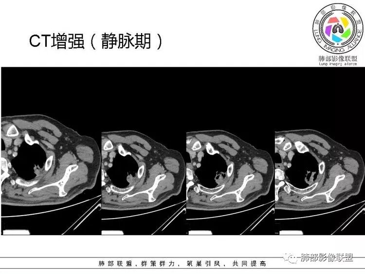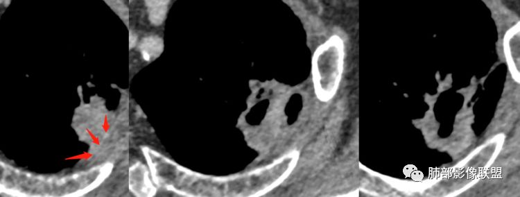 3.病灶轻度环形强化,壁稍显僵硬。灶周显示较清楚,未见磨玻璃晕。