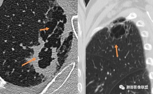 病理上在肺纤维化蜂窝区和相邻肺气肿交界区域常常会观察到肺泡上皮反复增生及支气管上皮鳞状细胞化生,然后通过不典型增生最后导致细胞恶性转化。并且有人认为且肺纤维化瘢痕可以导致淋巴管阻塞,局部潜在致癌物质增多,使得在该背景下容易发生肺癌。所以即使病灶形状不一定呈肿瘤样膨胀生长,但位于局限的肺气肿与肺纤维化交界区也需谨慎观察。