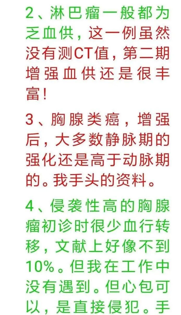 1.淋巴瘤一般都为乏血供,类癌血供还是很丰富。胸腺类癌,增强后大多数静脉期的强化还是高于动脉期的,这是类癌特点。