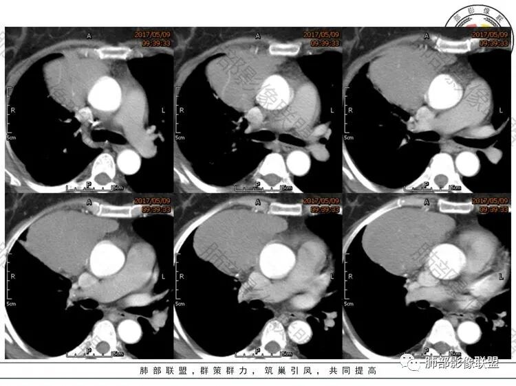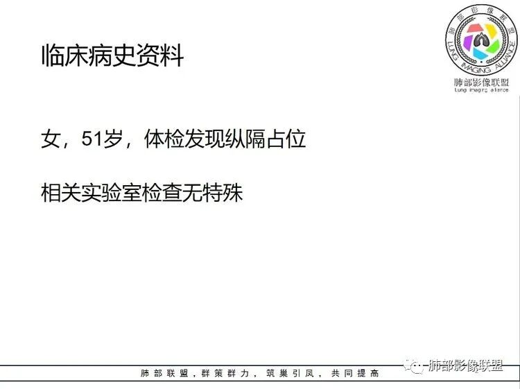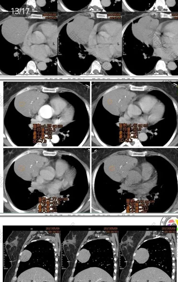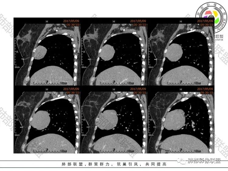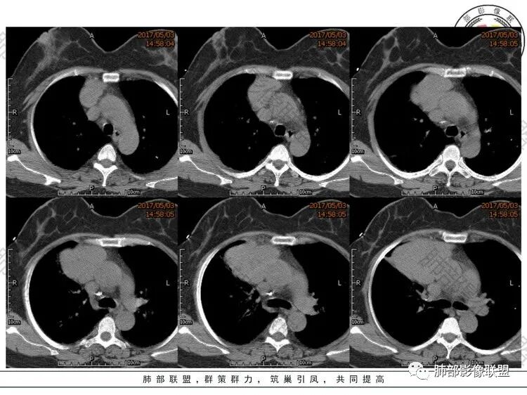 晨读,中老年女性,病史无特殊,CT前上纵隔肿块影,轻度强化,边界清楚,可见血管影,考虑胸腺瘤?