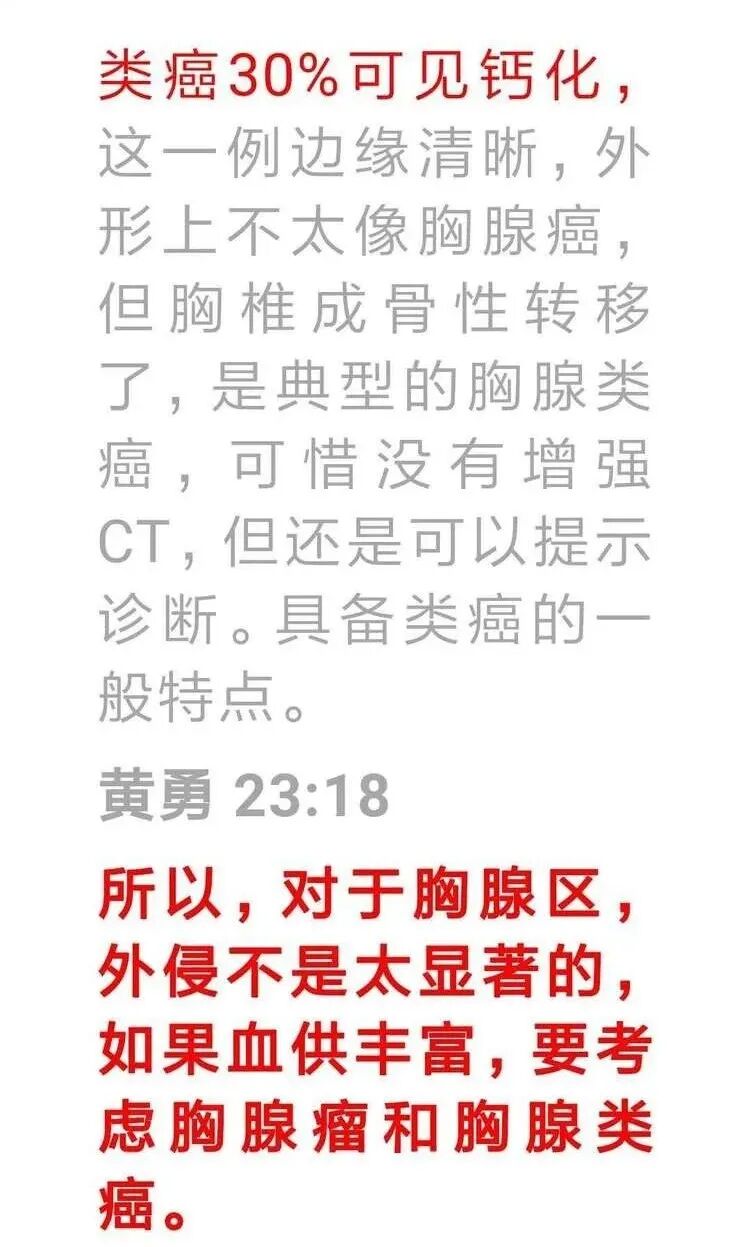 有钙化应该不考虑淋巴瘤吧,还有年龄也不符合,淋巴瘤中心生长,这个偏侧,而且,胸腺瘤也不一定会坏死,淋巴瘤,是不符合的太多。其实强化也不符合,结节融合型他没有。弥漫大b他坏死不够,t母年龄不符。更别说还有钙化,诊断淋巴瘤是可能性太低