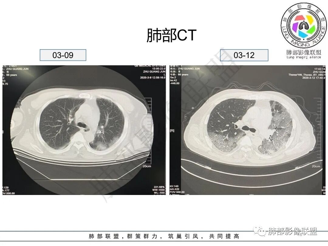 影像学短期内快速进展,初期双肺胸膜下散在磨玻璃影,下肺为主,边界模糊不清,迅速进展为双肺弥漫GGO伴少许实变,内部细网格征,双侧胸腔积液。