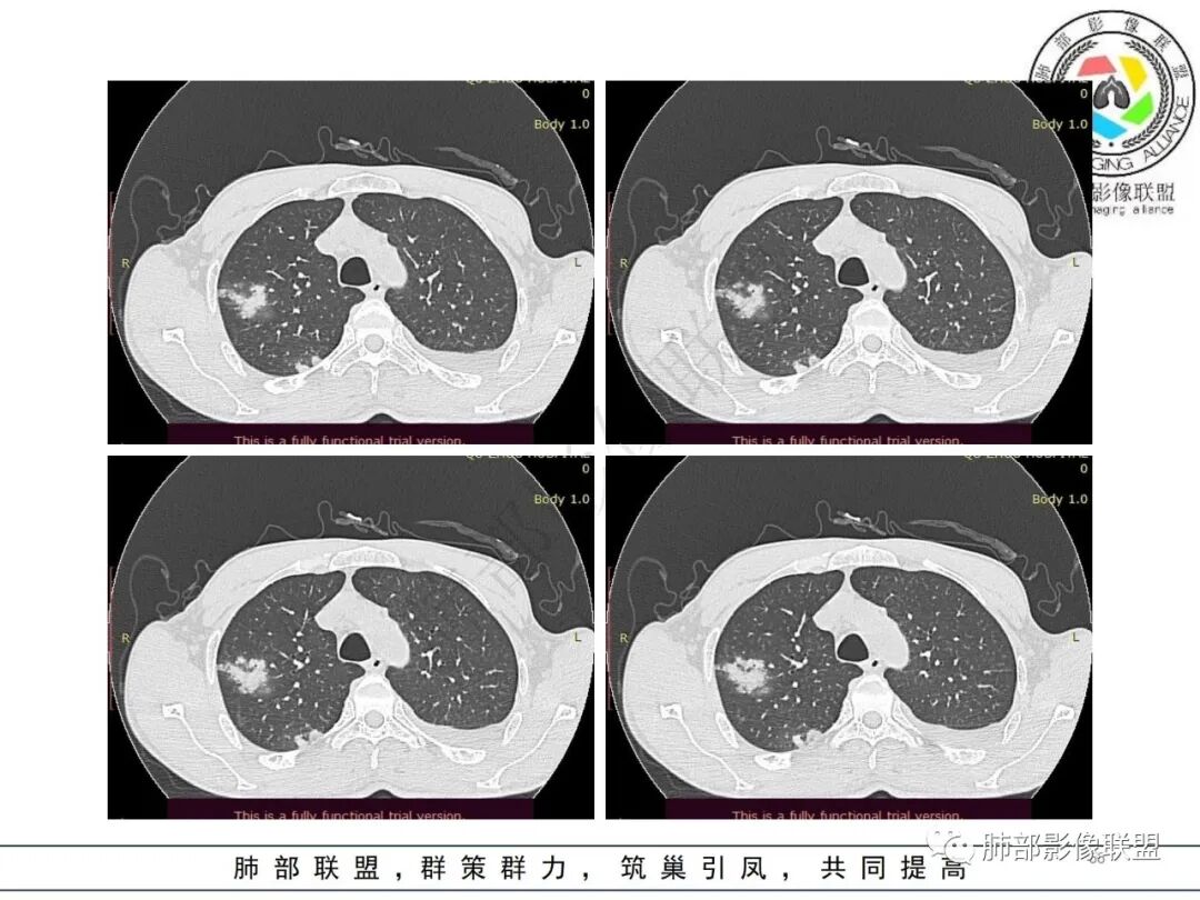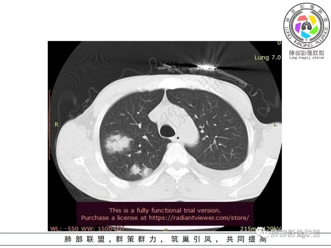 但是肺克肝脓肿血播到肺的,看过很多,没有类似晨读那样表现的,今天晨读不是太典型的血播影像表现;复查的影像就很典型