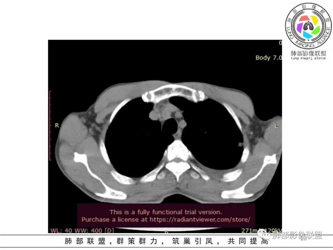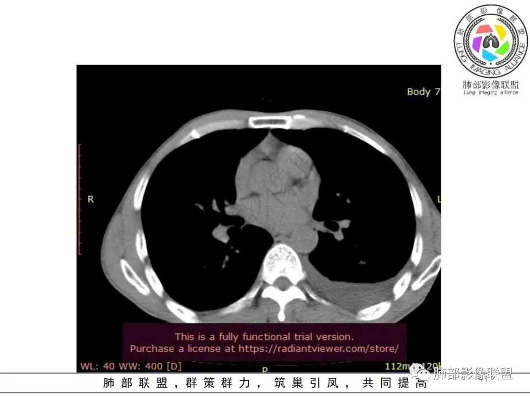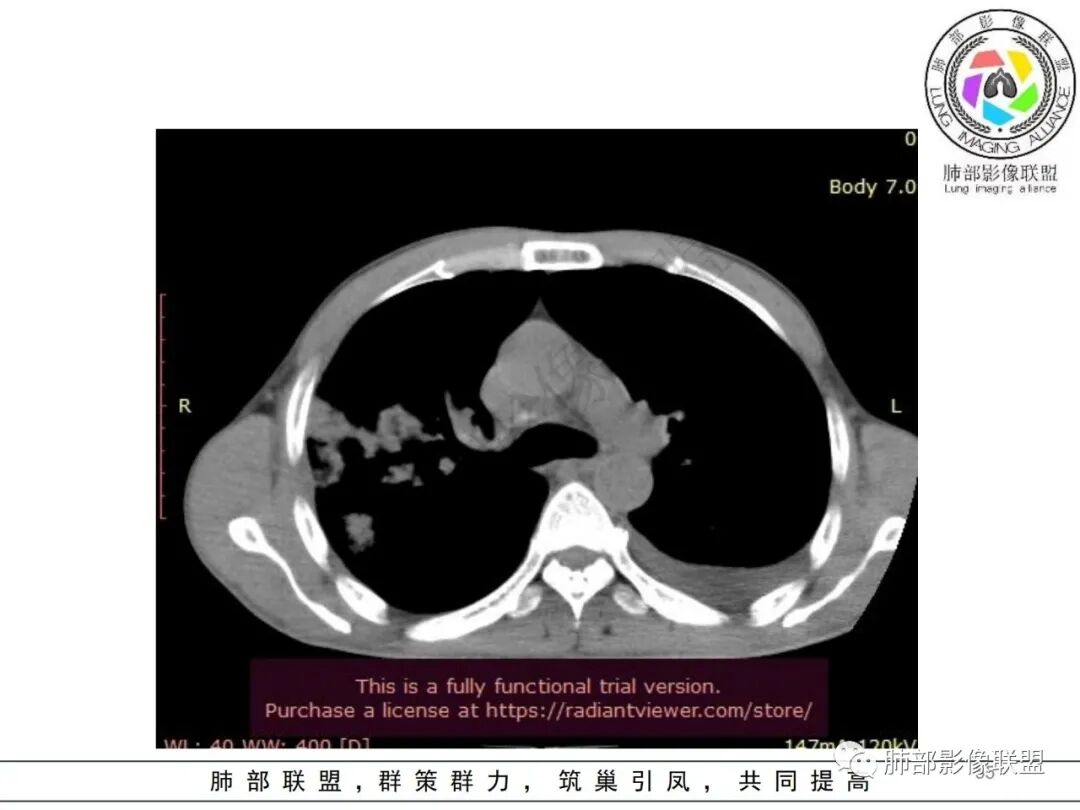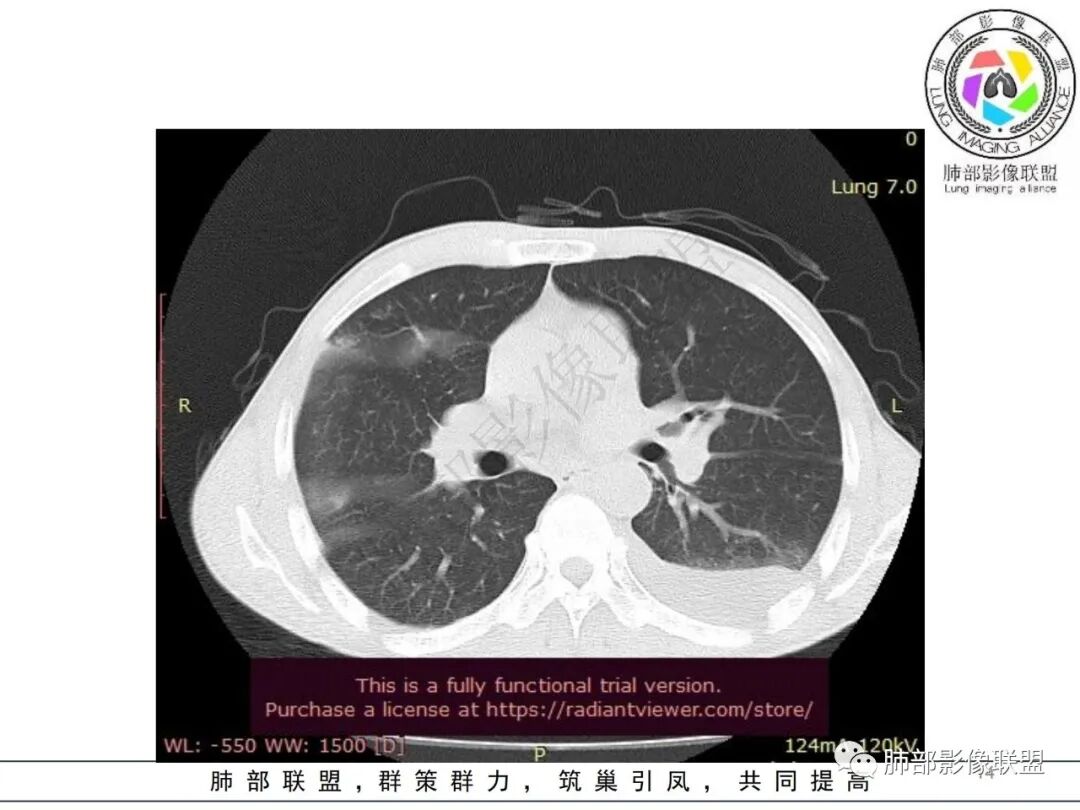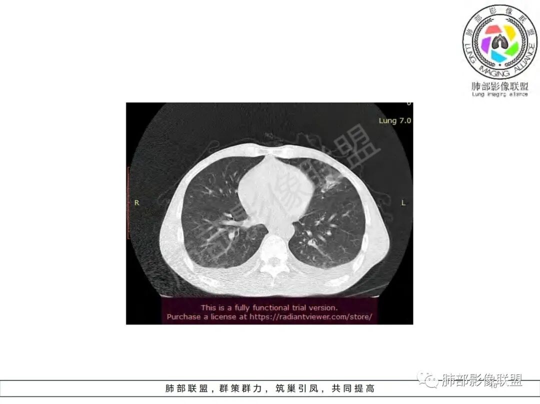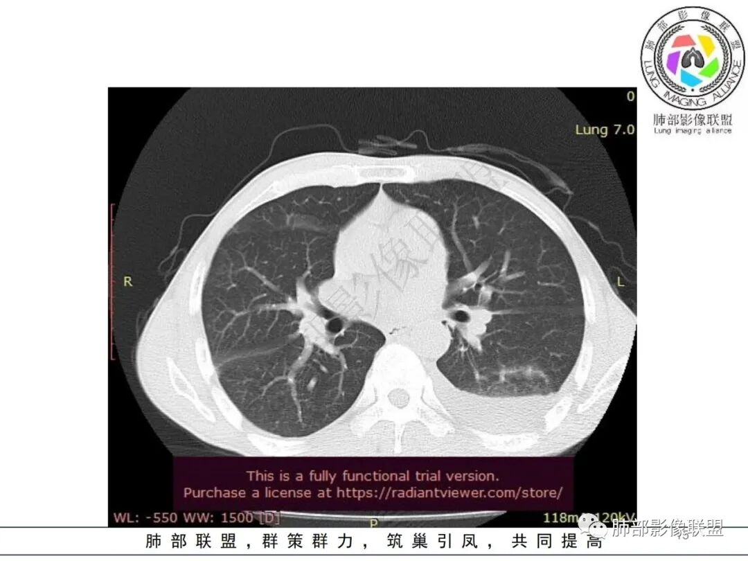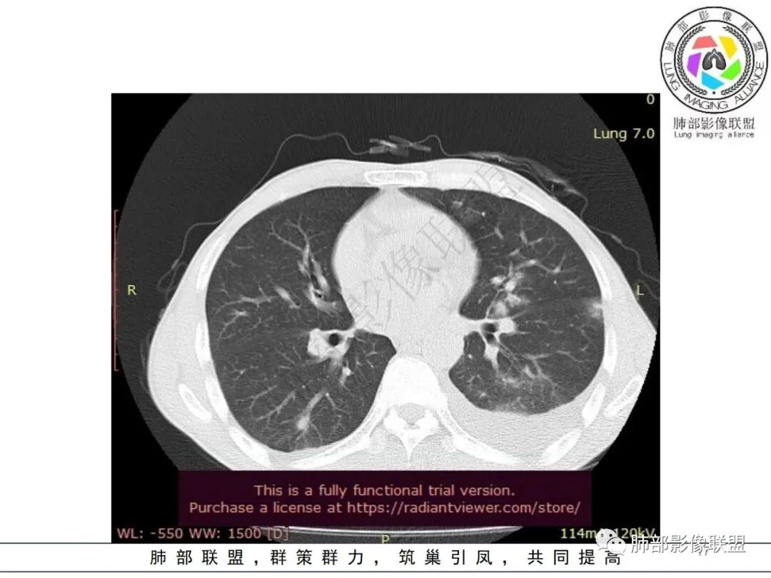 这一类表现等于是病灶没有沿气道趋势,不支持以肺实质、支气管的分布区域,我认为是沿气道到播散,间质蔓延为主