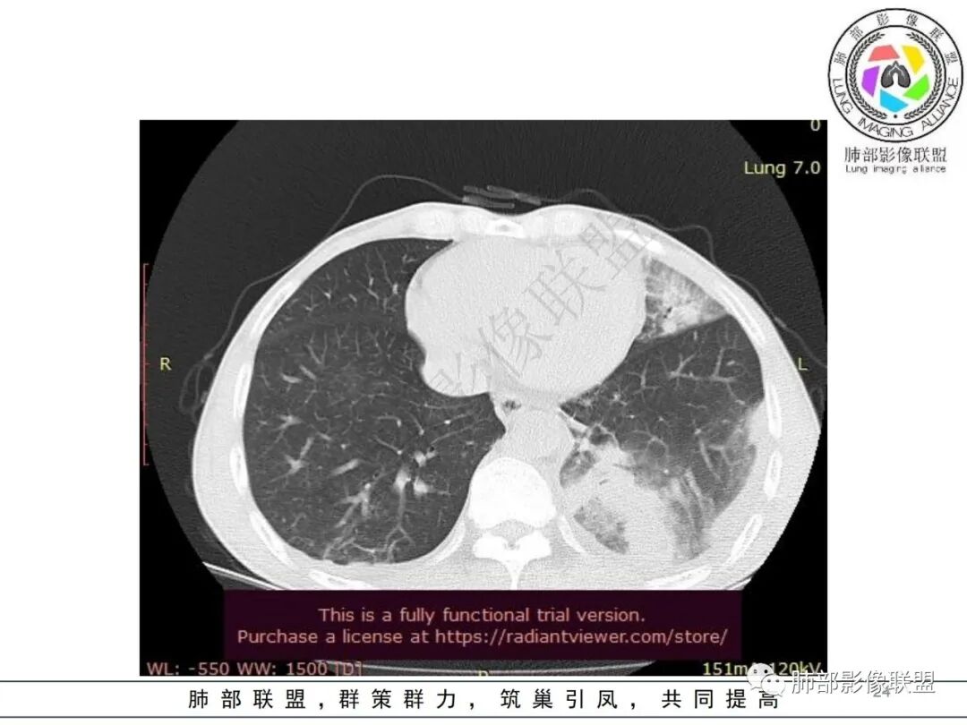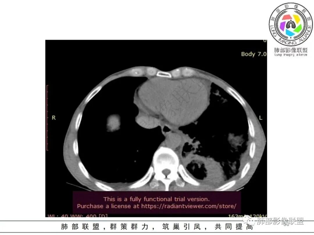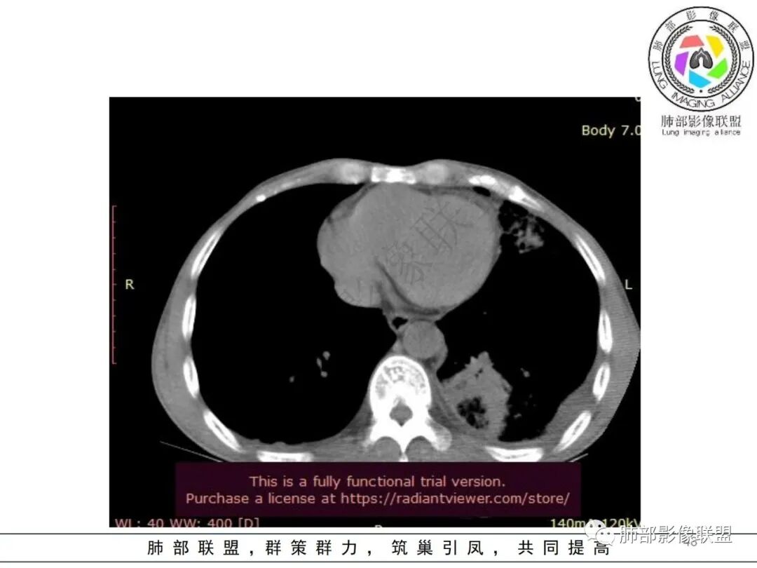 常规分析:左侧胸水,左下肺病灶大,周围渗出明显,气道壁增厚,内部还无坏死,复查坏死空洞也小