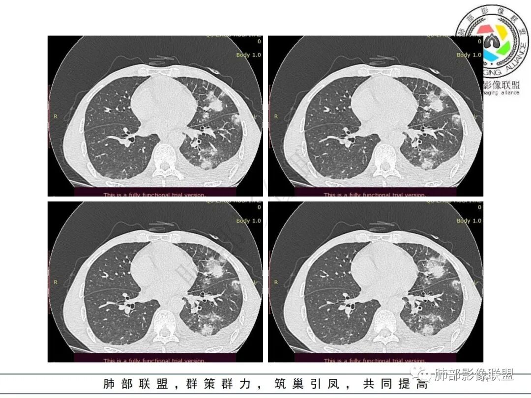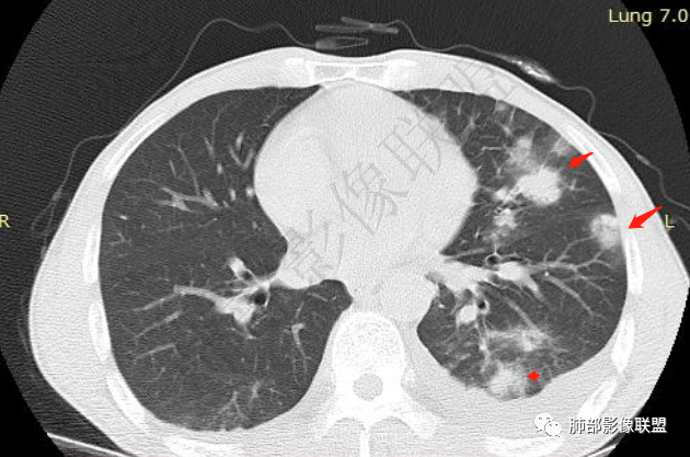 影像表现:双肺弥漫分布斑片影、实变影、磨玻璃影、结节影,晕征、反晕征,随机分布,部分病灶空洞形成前兆,左侧胸腔积液。