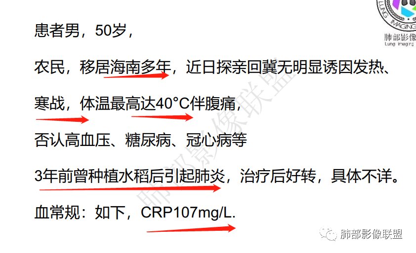 临床资料:中年男性,农民,近日自海南返冀后发热,伴寒战,腹痛。没有皮肤感染或脓肿的记载。既往有过下水田后肺炎病史。实验室炎性指标升高,淋巴细胞减低,后续查实糖尿病。