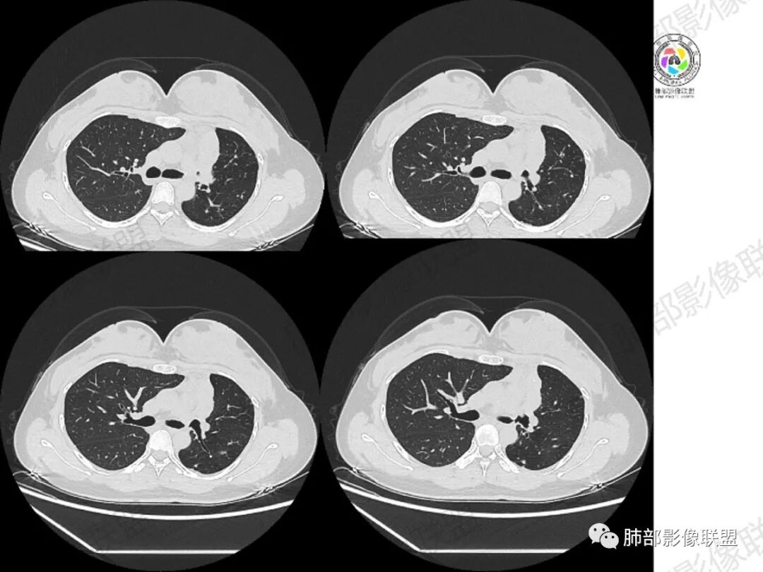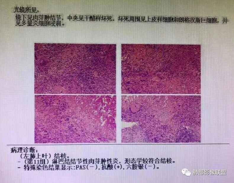 4.影像显示左肺上叶支气管阻塞,左主支气管多发附壁结节影,支气管壁散在结节影更常见于结核等慢性感染。