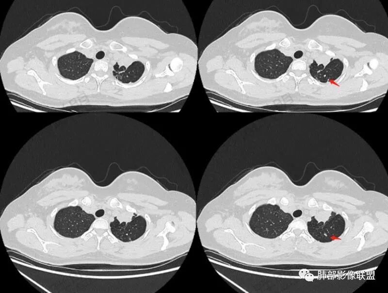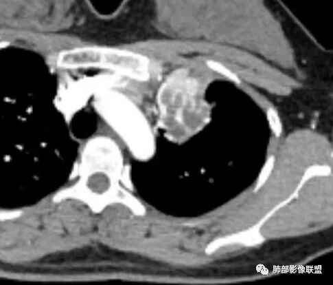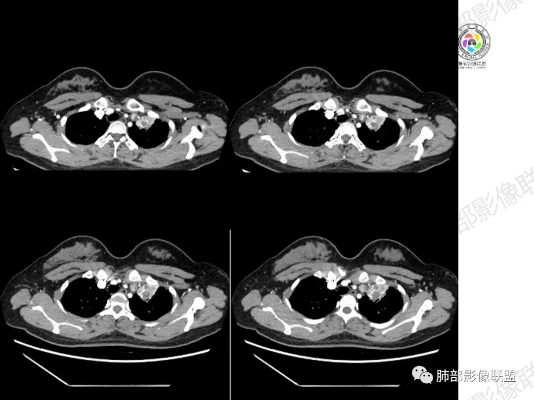 女性,29岁,咳嗽咳痰,痰中带血1月余,CT示左肺尖胸膜下纵隔旁不规则实变影,内部可见小点状钙化灶,支气管略狭窄,增强可见低密度不强化区,粘液栓?实性成分明显不均匀强化,局部与左肺动脉分界不清,另左肺可见多发小结节,考虑为恶性,黏表可能,鉴别结核