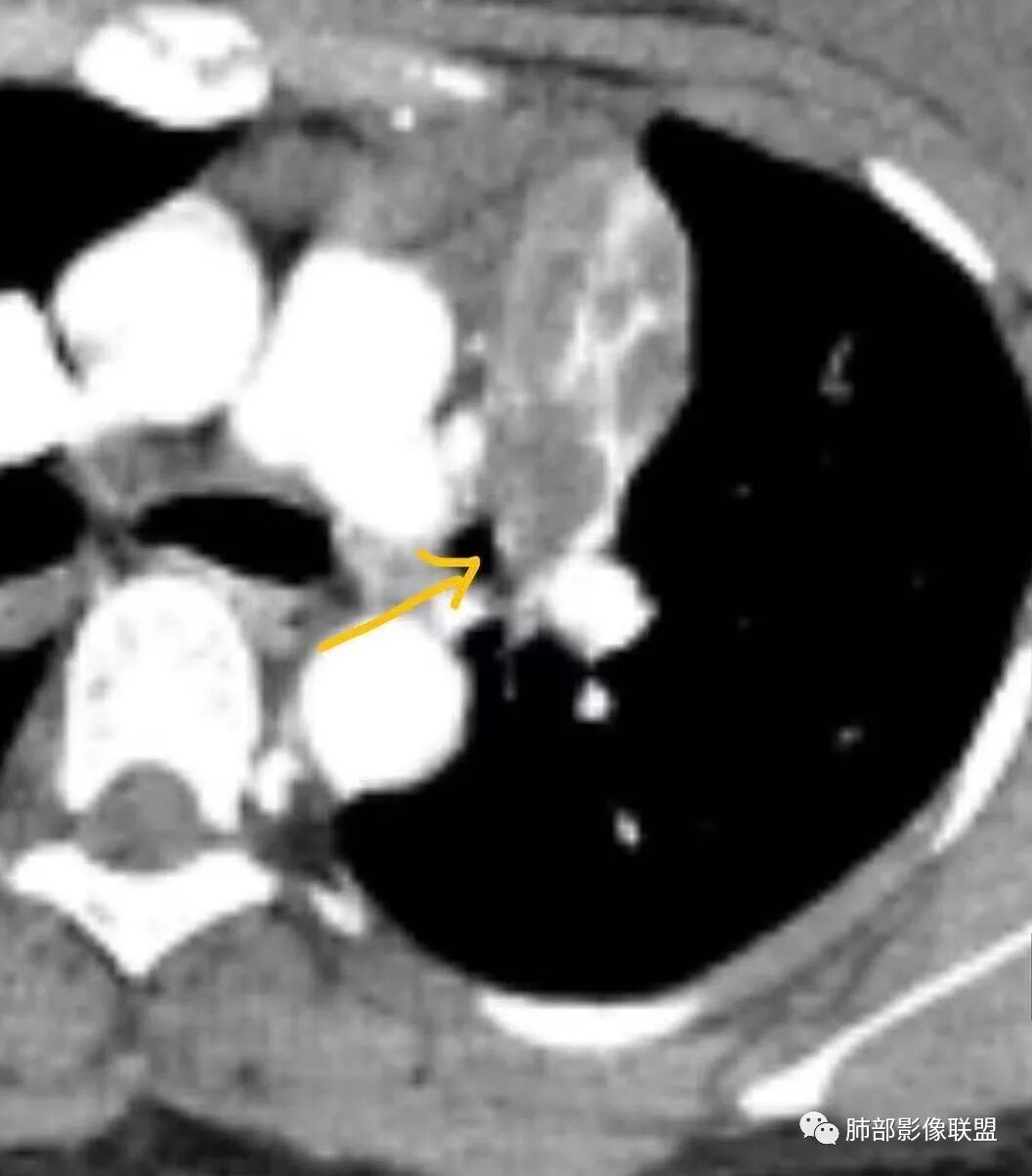 左上叶支气管堵塞,腔内粘液栓,粘液栓不强化,远端不张实变