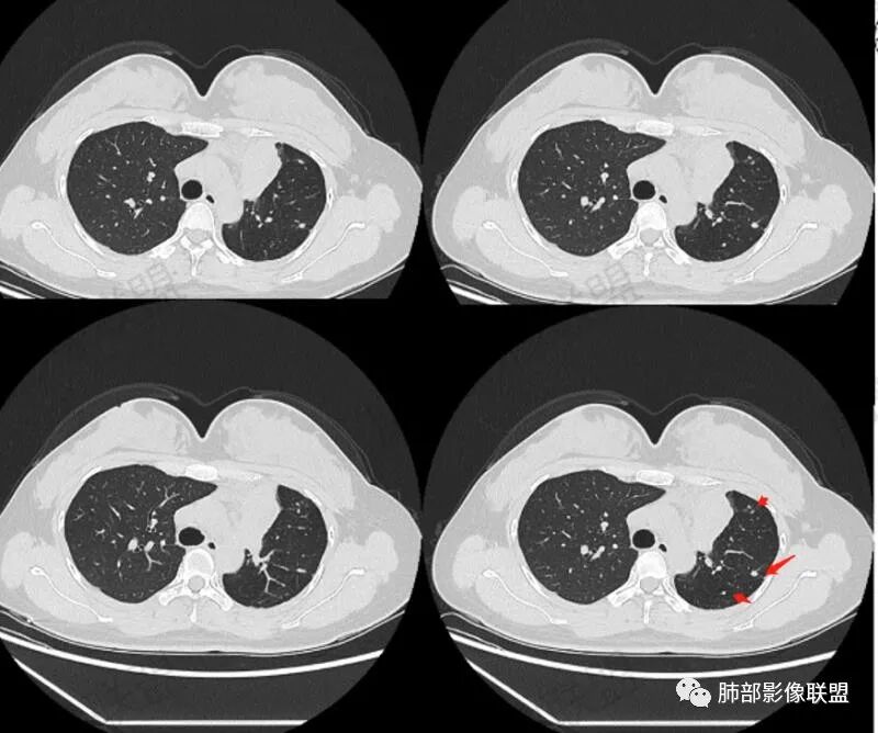 周围多发小斑片,病灶内可见点状钙化,29岁女性,警惕结核;