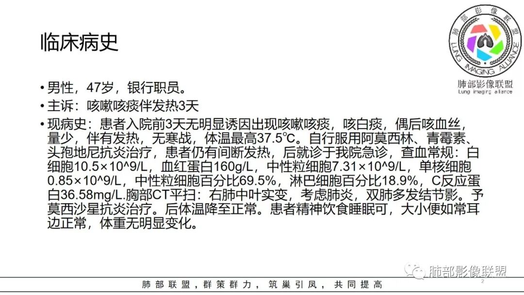 男,47岁,咳嗽咳痰发热三天,既往中耳炎病史。CT示双肺多发随机分布小结节,多位于胸膜下,部分伴小空洞,右肺中页不规则实变影,沿支气管血管束走行。实验室检查血沉,CRP增高。综合考虑为感染性病变,隐球可能,鉴别GPA