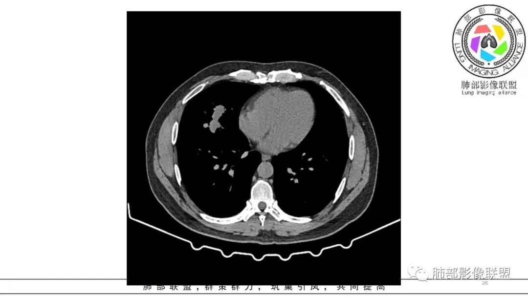 双肺多发实性小结节,边清,多位于胸膜下。右肺中叶不规则实变影,沿支气管血管束走行,似有跨叶。