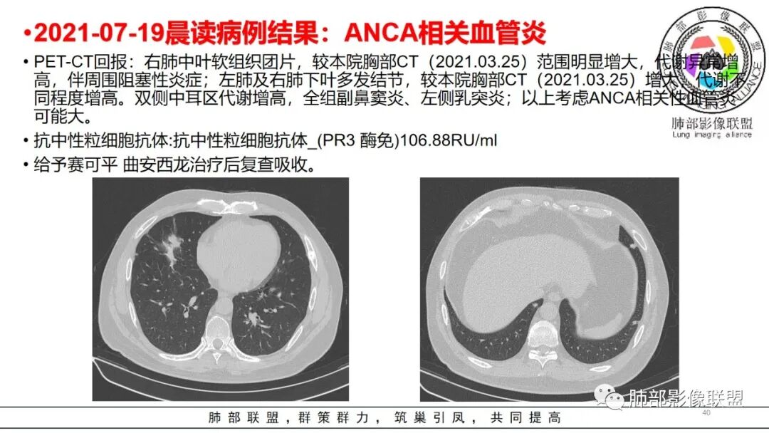 一、肉 芽 肿 性 多血管炎(granulomatosis with polyangiitis,GPA)是一种多器官受累的坏死性肉芽肿性血管炎,曾用名韦格纳肉芽肿病(Wegener granulomatosis,WG)。GPA 属于自身免疫性疾病,为抗中性粒细胞胞浆抗体(anti-neutrophilcytoplasmic antibodies,ANCA)相关性小血管炎 。GPA 病因尚不明确,其病理以血管壁的炎性反应为特征,病变主要累及小动脉、静脉及毛细血管,可侵犯上、下呼吸道和肾脏。临床表现多样,常表现为鼻窦炎、肺病变和肾病变,还可累及关节、肌肉、皮肤、眼、心脏、神经系统等 。(一)影像学表现肺部病变影像学有三大特征 :(1)多样性:病灶呈毛玻璃状、线状、结节状等多种形态的阴影。(2)多发性:在肺部中、下野可同时或先后出现多处病灶。(3)空洞性结节:部分患者的结节内可出现空洞(二)诊断标准目前,临床上仍广泛采用 1990 年美国风湿病学会制定的分类标准 :(1)鼻或口腔炎性反应:痛性或无痛性溃疡,脓性或血性鼻腔分泌物。(2)胸部 X 线片异常:胸部 X 线片示结节、固定浸润病灶或空洞。(3)尿沉渣异常:镜下血尿(红细胞 > 5 个/HP)或出现红细胞管型。(4)病理性肉芽肿性炎性改变:动脉壁或动脉周围,或血管(动脉或微动脉)外区域有中性粒细胞浸润形成肉芽肿性炎性改变。符合 2 条或 2 条以上时可诊断,诊断的敏感度和特异度分别为 88.2%和 92.0%。 GPA 患者中 ANCA 和 PR3 的特异度在80%~90%,其敏感度可反映疾病的活动性,急性活动期患者的 ANCA 阳性率高。虽然 ANCA 阳性并不是 GPA 的特异性诊断指标,但 ANCA 阳性的患者如伴有系统表现、上呼吸道症状,应高度怀疑 GPA。参考文献:[1]刘彧.肉芽肿性多血管炎的诊治.中国医师进修杂志[J].2010, 7 (40):667-669.