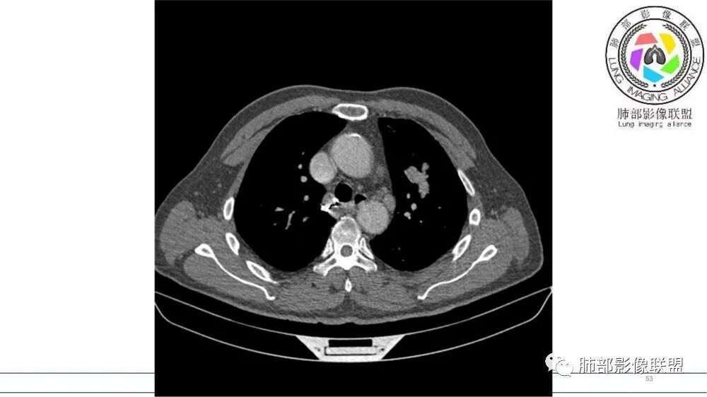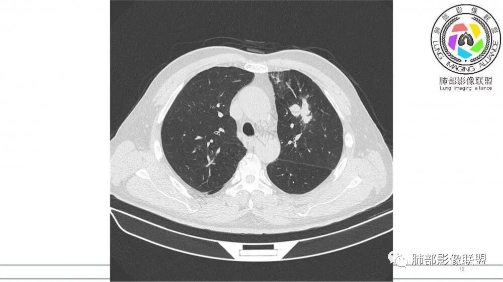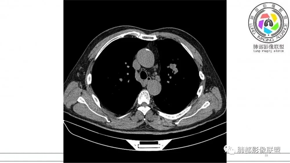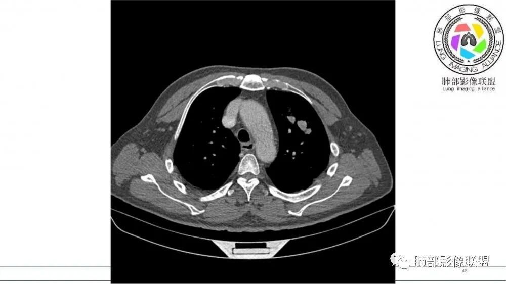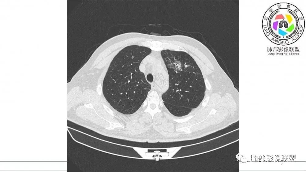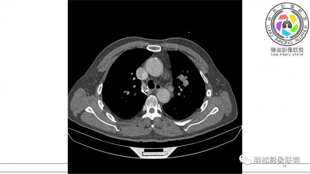 老年男性,长期吸烟史。左上肺前段沿支气管走形的指套样病变,增强可见病灶强化(排除结核、ABPA(也无气喘症状)),远端多发点状高密度影。考虑恶性肿瘤,鳞癌可能性大。