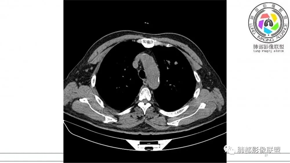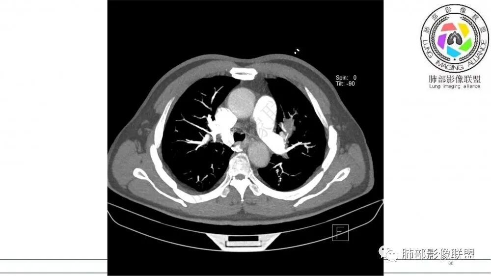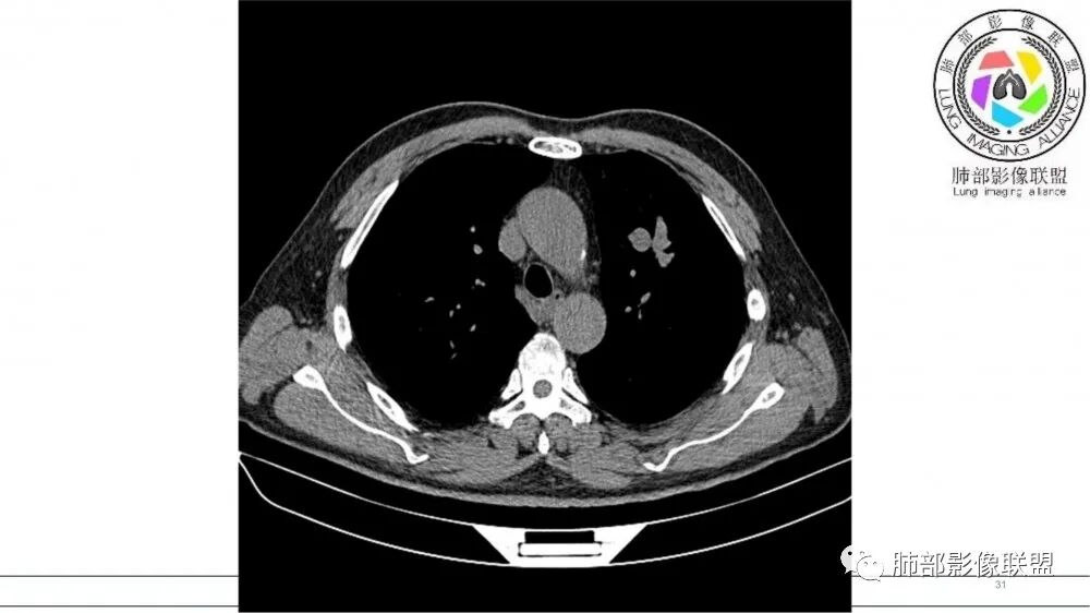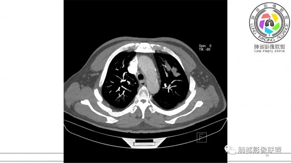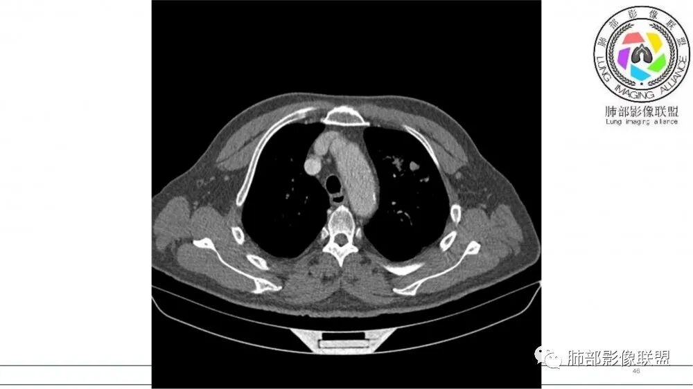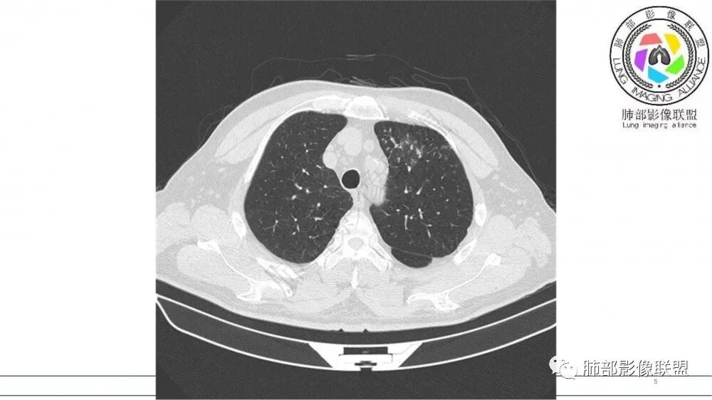 老年男性,长期吸烟史。左上肺前段沿支气管走形的指套样病变,增强可见病灶强化(排除结核、ABPA(也无气喘症状)),远端多发点状高密度影。考虑恶性肿瘤,鳞癌可能性大。
