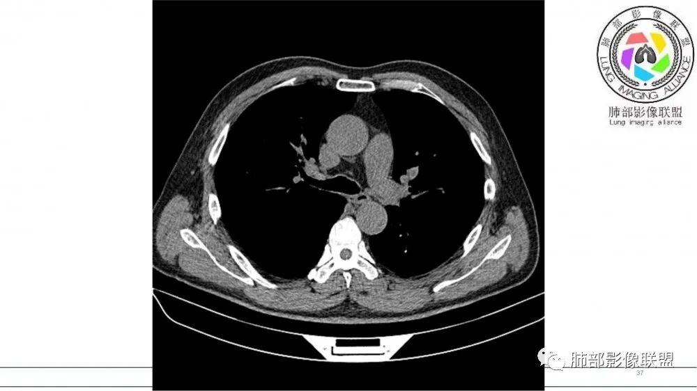 文献报道周围型小细胞肺癌发生率为全部小细胞肺癌类型的 35%,近来有学者认为周围型病灶发生率可能更高。CT检查表现为肺实质结节或团块状,密度多较均匀,表现为浅分叶状,边缘光滑、锐利而有时可以酷似良性肿瘤。毛刺征、胸膜凹陷征与空洞、钙化少见,周围血管集束征表现为阴性,出现推移让位等情况。文献报道,增强扫描周围型肿块常表现为“沼泽地样”轻中度强化,增强后密度较低略为均匀,出现小片稍低模糊坏死 。