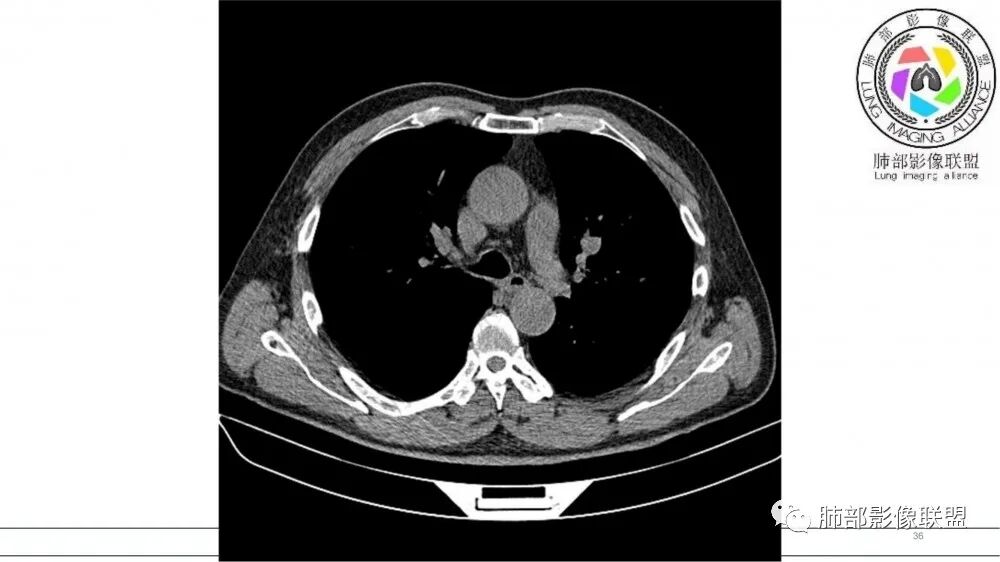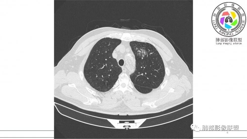 左肺上叶前段支气管内铸形生长软组织影,增强后均匀强化,远侧见斑片状磨玻璃影。考虑恶性病变,粘表?粘液腺?